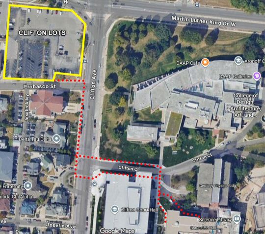1. For Dry Dredgers dues-paying members who already have a parking pass,Park in Clifton Lots, located just west of UC's campus. The lots are located at the corner of Probasco Street and Clifton Avenue, with the entrance(s) on Probasco Street. The lot is outlined in yellow on the map and the route to Braunstein Hall is dotted in red. Make sure to use the crosswalks, as Clifton Avenue can be rather busy!