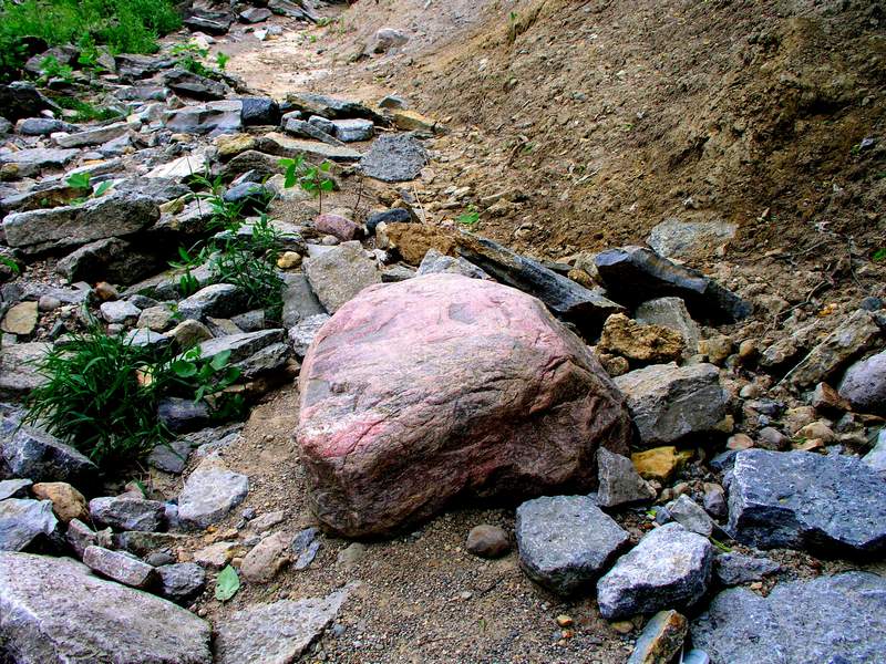 bottom where the rocks collected at the concrete border on either side of the hill cut.