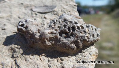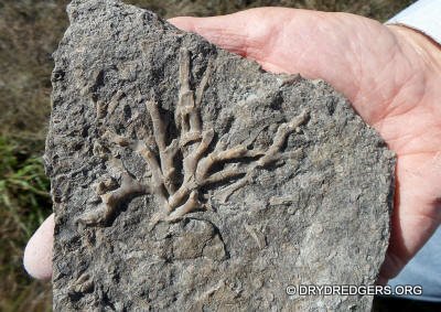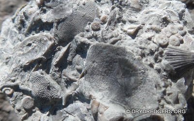 Of course, the most common fossil, found by the tens of billions on the scenic byway is the bryozoan. These tiny animals made colonies of branching and encrusting hard shells that carpeted the late Ordovician sea floor. This sea was a warm, shallow water environment below the equator.