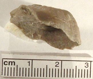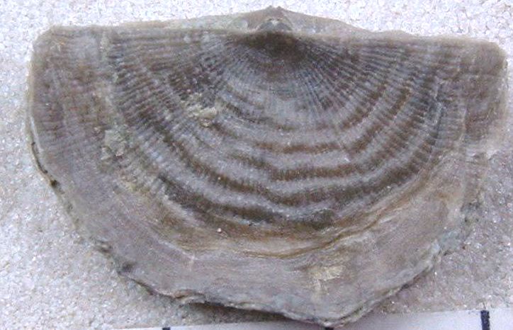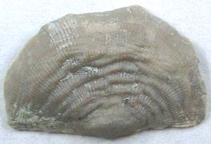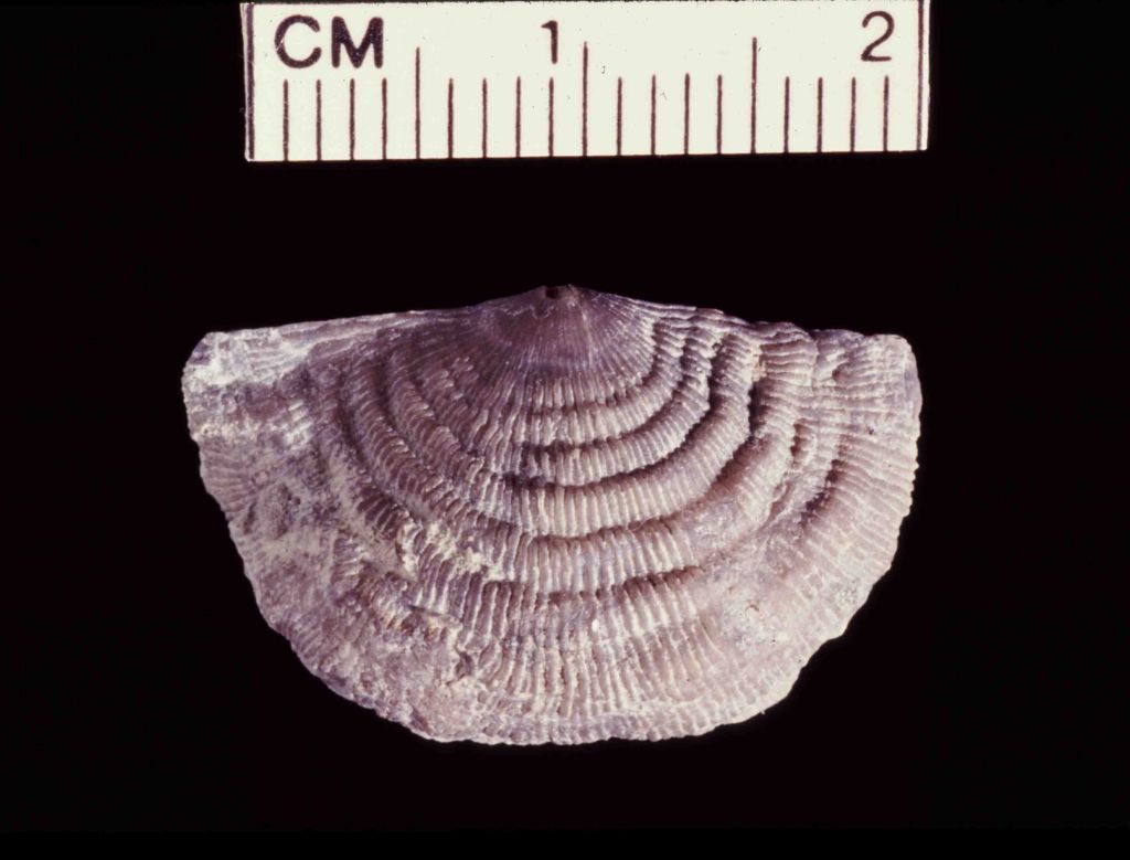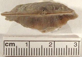 Found in the RichmondianMid-size brachiopod, rectangular in shape. It is distinguished by four strong wrinkle-like growth lines in the dorsal valve that begin and end at the hinge line but curve parallel to the hinge line as they move away from it. On larger shells, there can be an abrupt curving of the valves toward the margin with the brachial valve convex and pedicle concave.