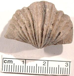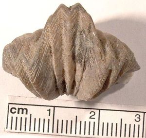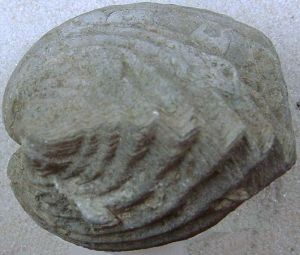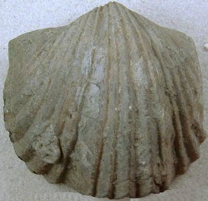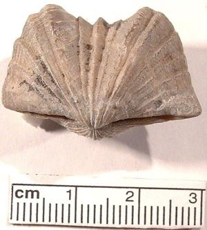Found in McMillan/Grant Lake. A large brachiopod, globular in shape, with bold costa on the valves. There are three costa in the pedicle sulcus and three costa on the brachial fold. There are two subspecies. Vinlandostrophia ponderosa ponderosa is the more common with an interarea as long as or nearly as long as the shell width. Vinlandostrophia ponderosa auburnensis has a much shorter interarea no longer than the width of the dorsal valve fold. Vinlandostrophia ponderosa auburnensis is confined to the Mt. Auburn.