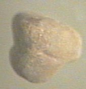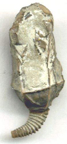 This is a nearly complete specimen of the Rhombiferan Cheirocystis fultonensis was found that the base of the Kope Formation Fulton Beds (left and right sides shown above). It is missing the stem. The specimen has not been prepared and so is covered with matrix. As of this writing, less than a dozen complete specimens of this species have been found and so each specimen is of scientific importance. This one was found by Bill Heimbrock in March 2001. Note the ambulacra exposed at the top of the specimen.