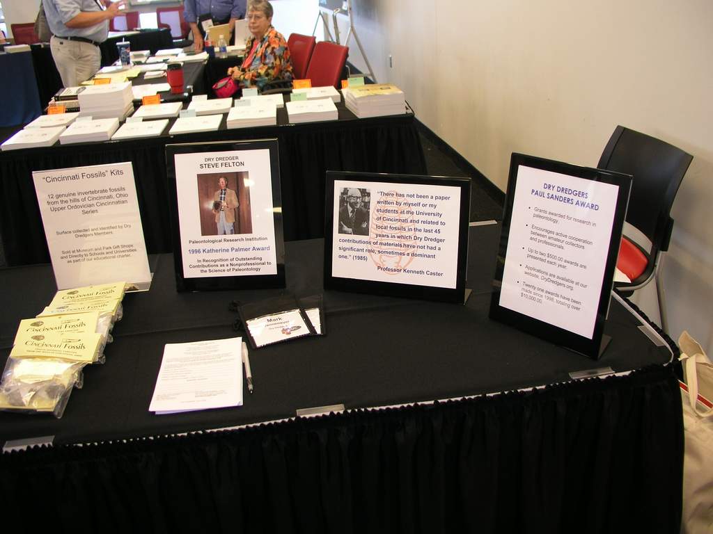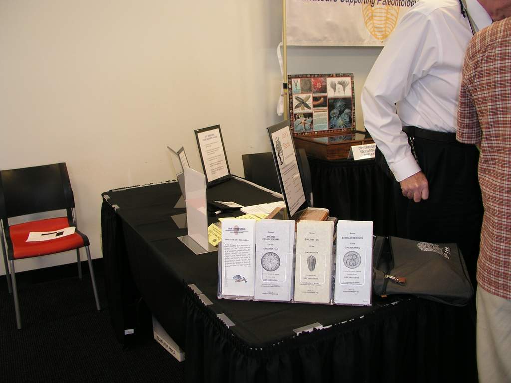 The 3 tables were arranged in an open rectangle, allowing visitors to come inside and explore the Dry Dredgers' world. The message conveyed by our booth was to let the professional paleontological community know that the Dry Dredgers have been working to support the advancement of Paleontology since 1942, in our support for the education, helping amateurs and students, and supporting research in the areas of geology and paleontology.