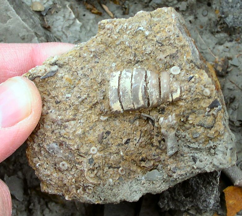 The molluscs on this site are especially nice because they have brown shell remaining on them. The Cephalopods are a treasured find here, because the type of preservation makes them excellent specimens. Here are some beautiful specimens, showing each side in a separate picture.