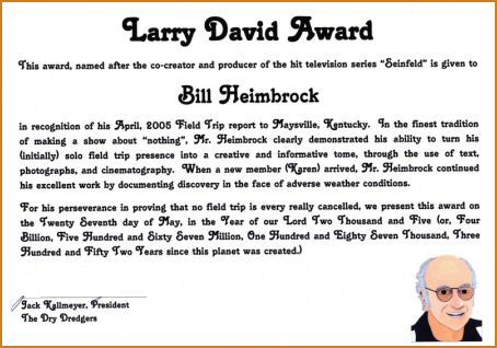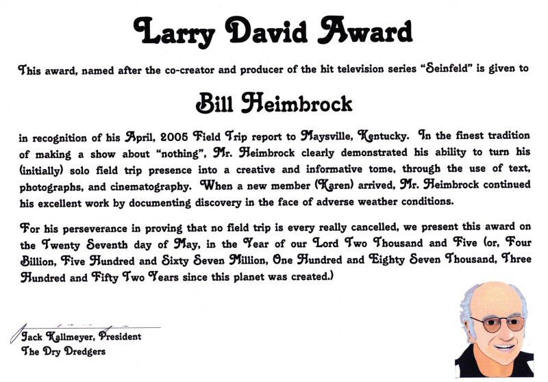 Our Field Trip Chair, Bob Bross, presented me an award at the May meeting for my April 2005 field trip report. I was very honored and overwhelmed by Bob's generosity in preparing and presenting this framed award to me. Thank you Bob! I want to share this award with you, the DryDredgers.org guest. It's pretty great! I also extend my congratulations to Karen for being the only field trip participant. She braved rugged, slippery terrain and found some great fossils with me. - - - Bill Heimbrock
