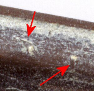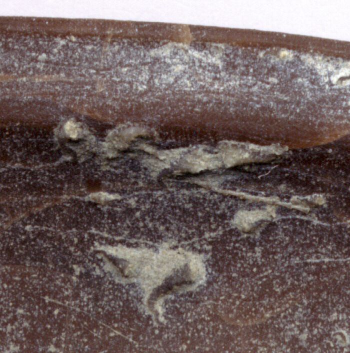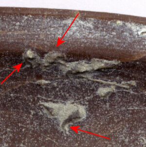 I examined the above specimen later at home and found that annelid worms had enjoyed living on this large trilobite while it was swimming the Ordovician ocean, taking advantage of a constant flow of food across the edge and grooves of the trilobite. Take a close look at the next two pictures. These are "tube" worms, probably Cornulites and tell a valuable tale to Paleontologists of the feeding and swimming of Isotelus trilobites and their friends.