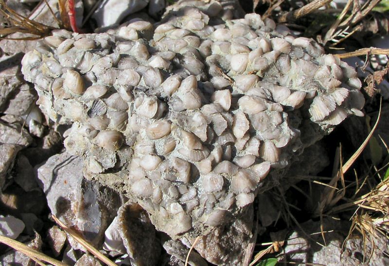 Several examples of tight clusters of the tiny Brachiopod, Zygospira,