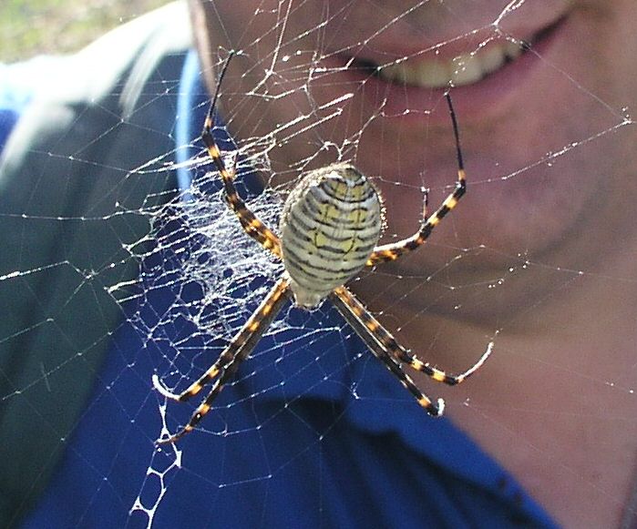 And our field trip chairperson would not let us go without spying the living arthropods. This one appears to be a variety of Argiope. We were all amazed at the size of this species, which we found in great numbers on this site. Don't be afraid of them! Happy Halloween!