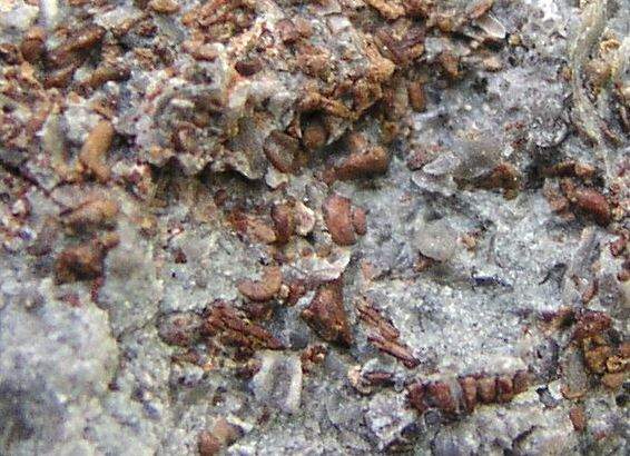 millions of tiny snails called Cyclora, preserved in a yellow-brown phosphate.