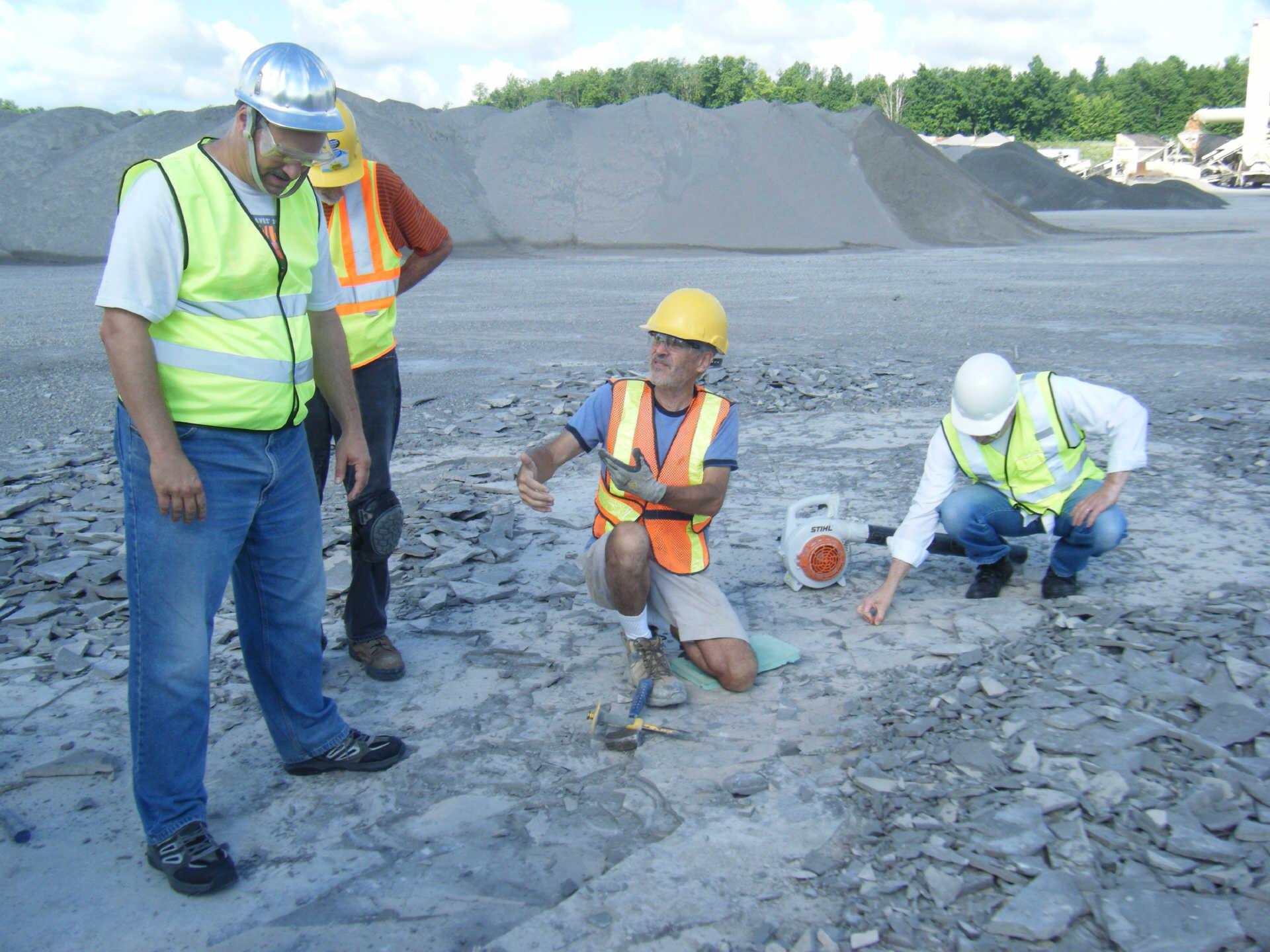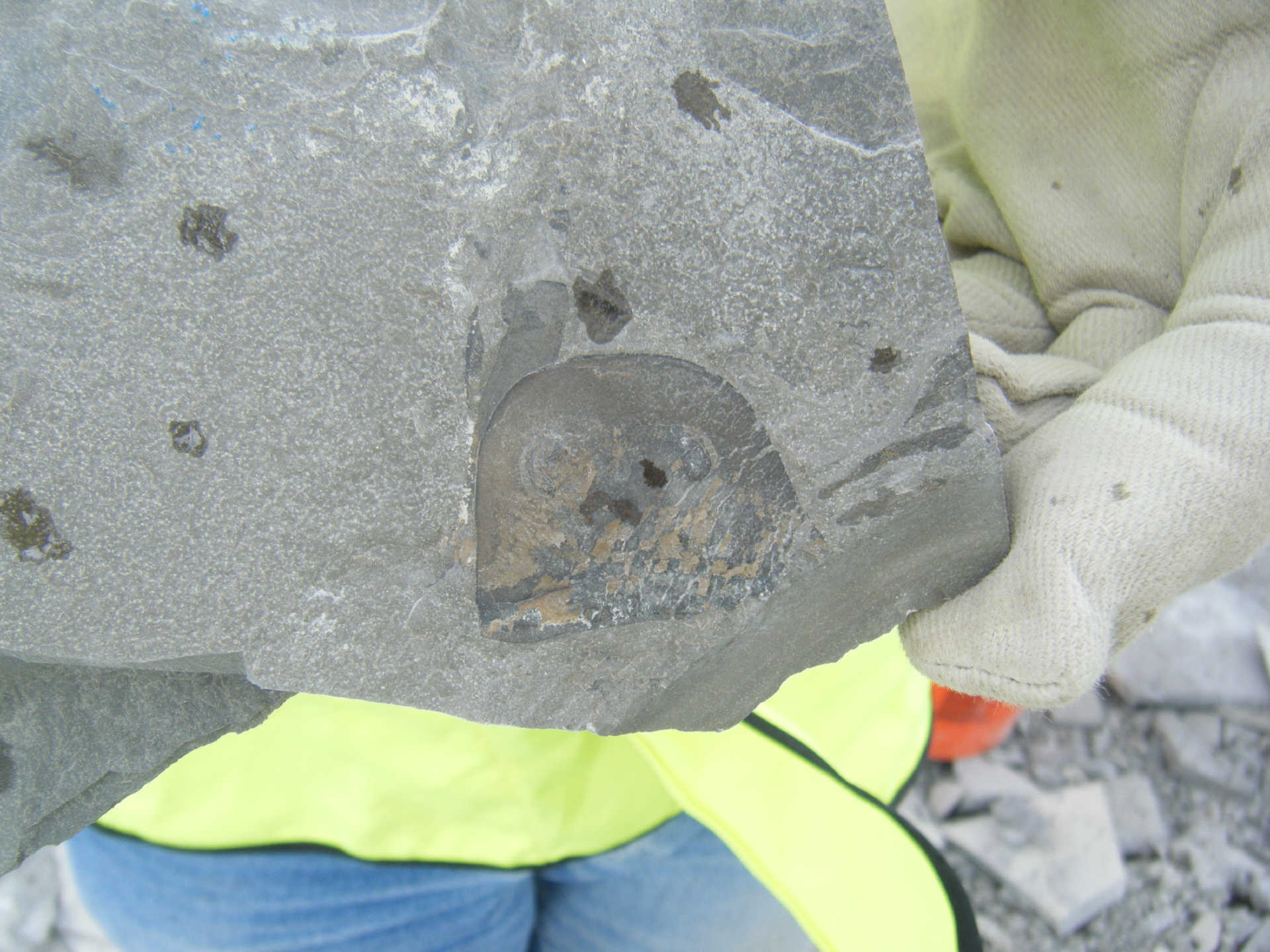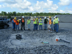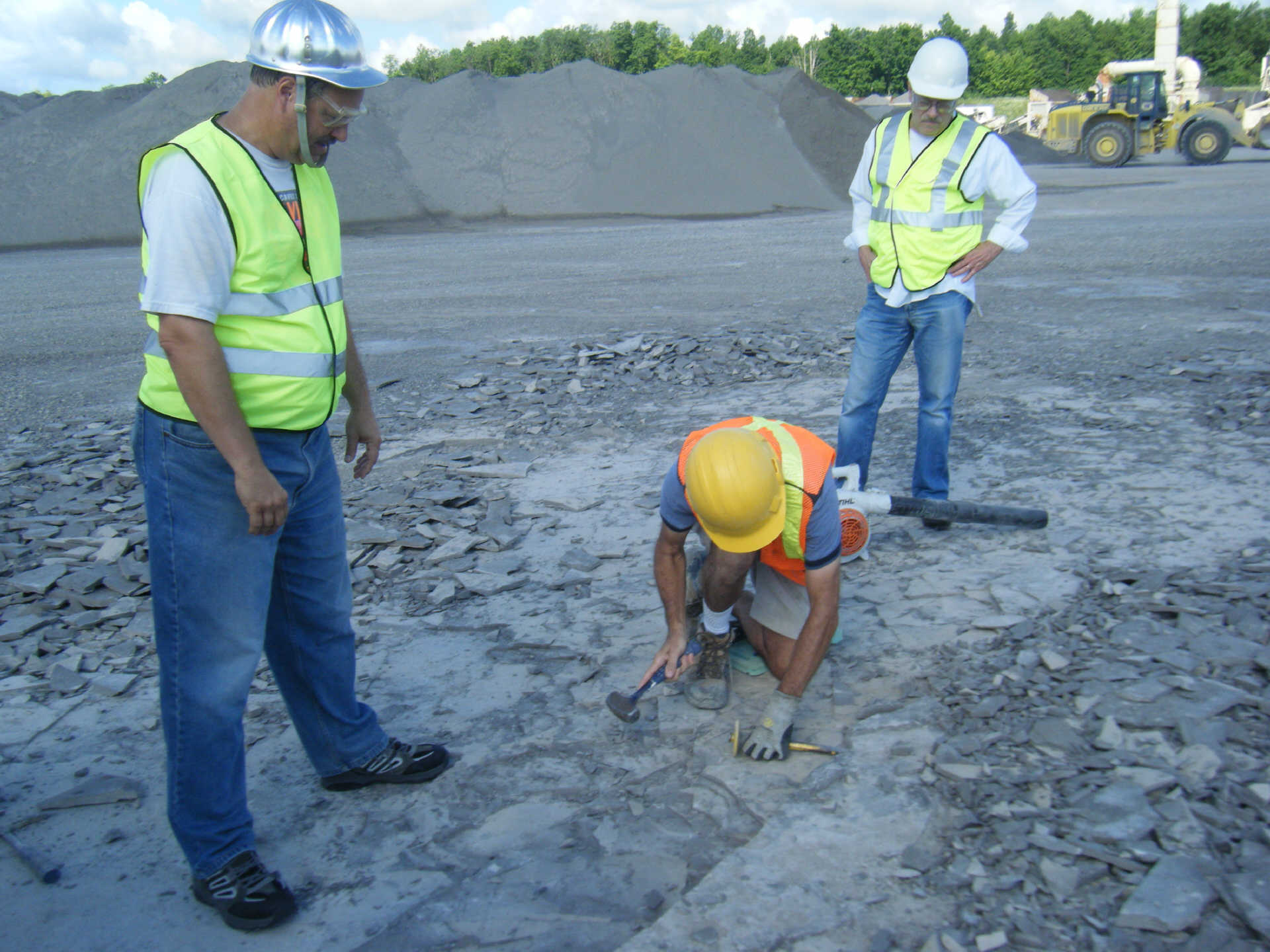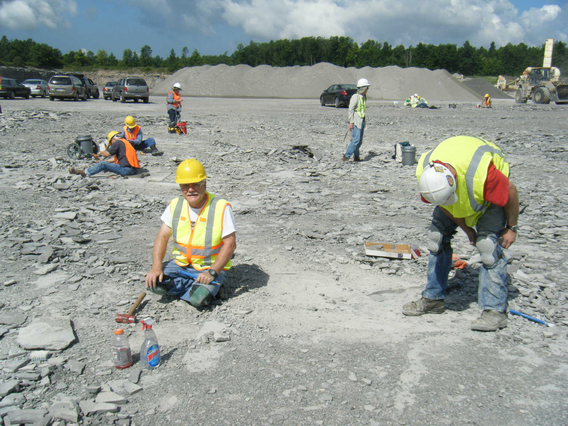 Approximately 20 of us went to the Ridgemount Quarry in Fort Erie, Ontario, Canada on Friday. There was a light drizzle when we met for breakfast, but skies mostly cleared by the time we crossed the border. Other than a few momentary “mists” (which actually felt good) conditions remained dry at the site. With the assistance of two Canadian amateur paleontologists on site, we were soon digging for Eurypterids. While none of the U.S. attendees found any whole ones, one of the Canadians did – proving they WERE there. This type of excavation was very different from what most of us were used to, so the learning experience was very beneficial. Everyone found something worth bringing home, so it was a good day overall.