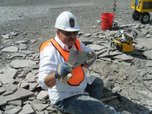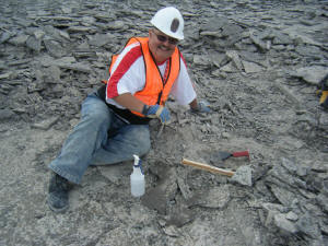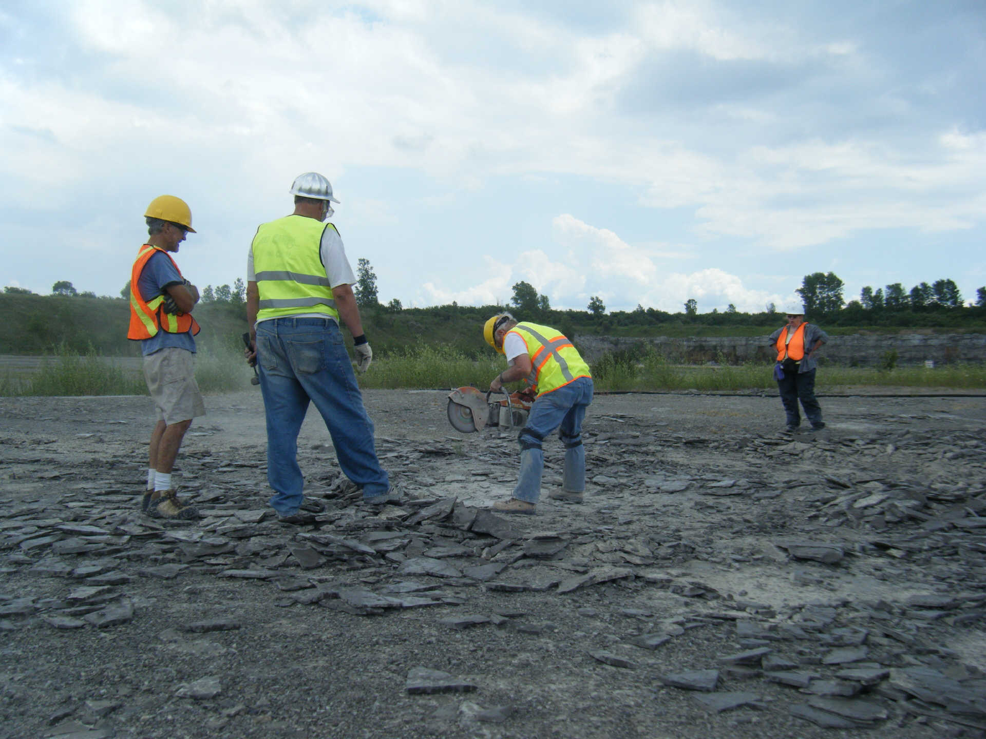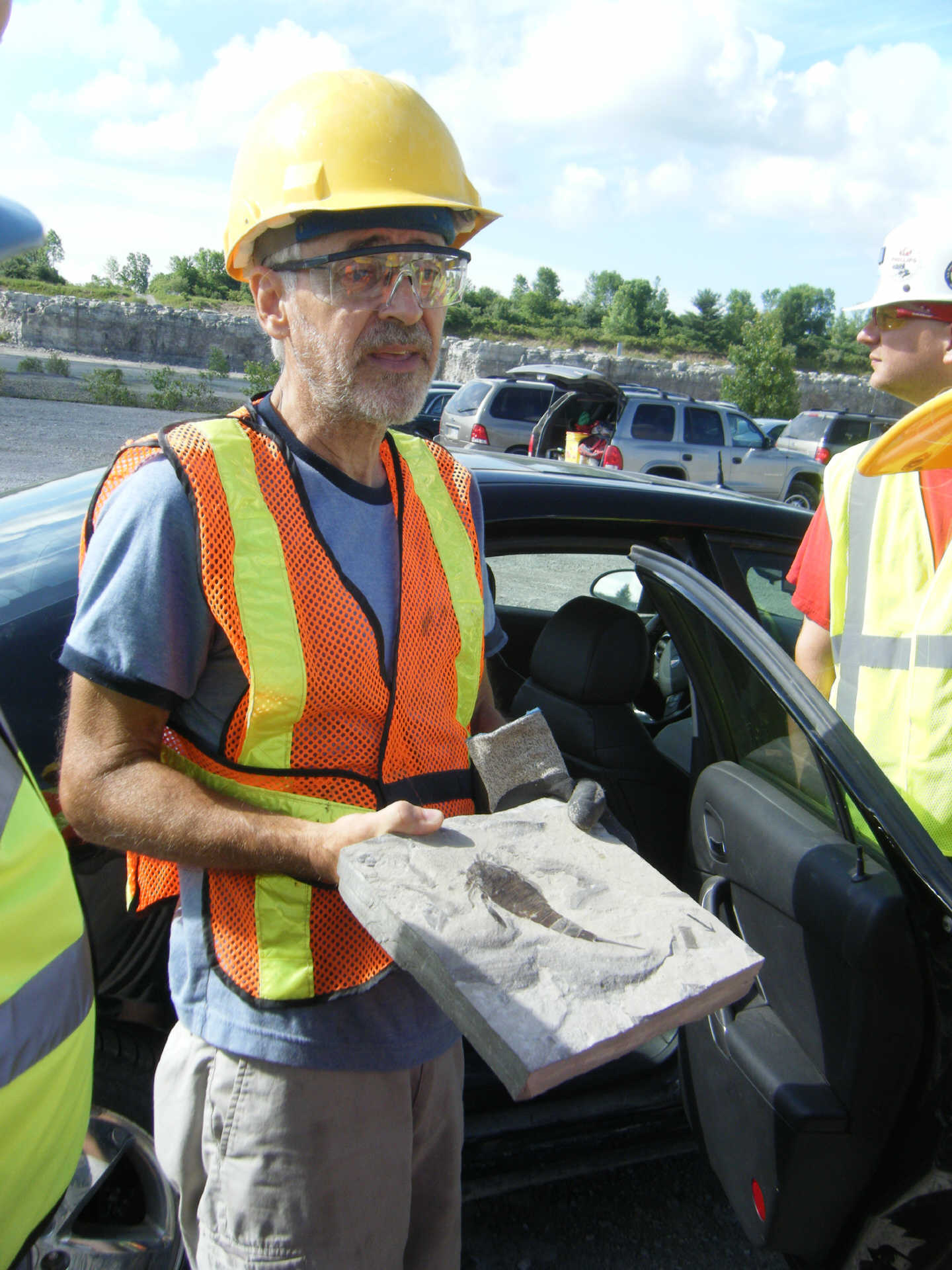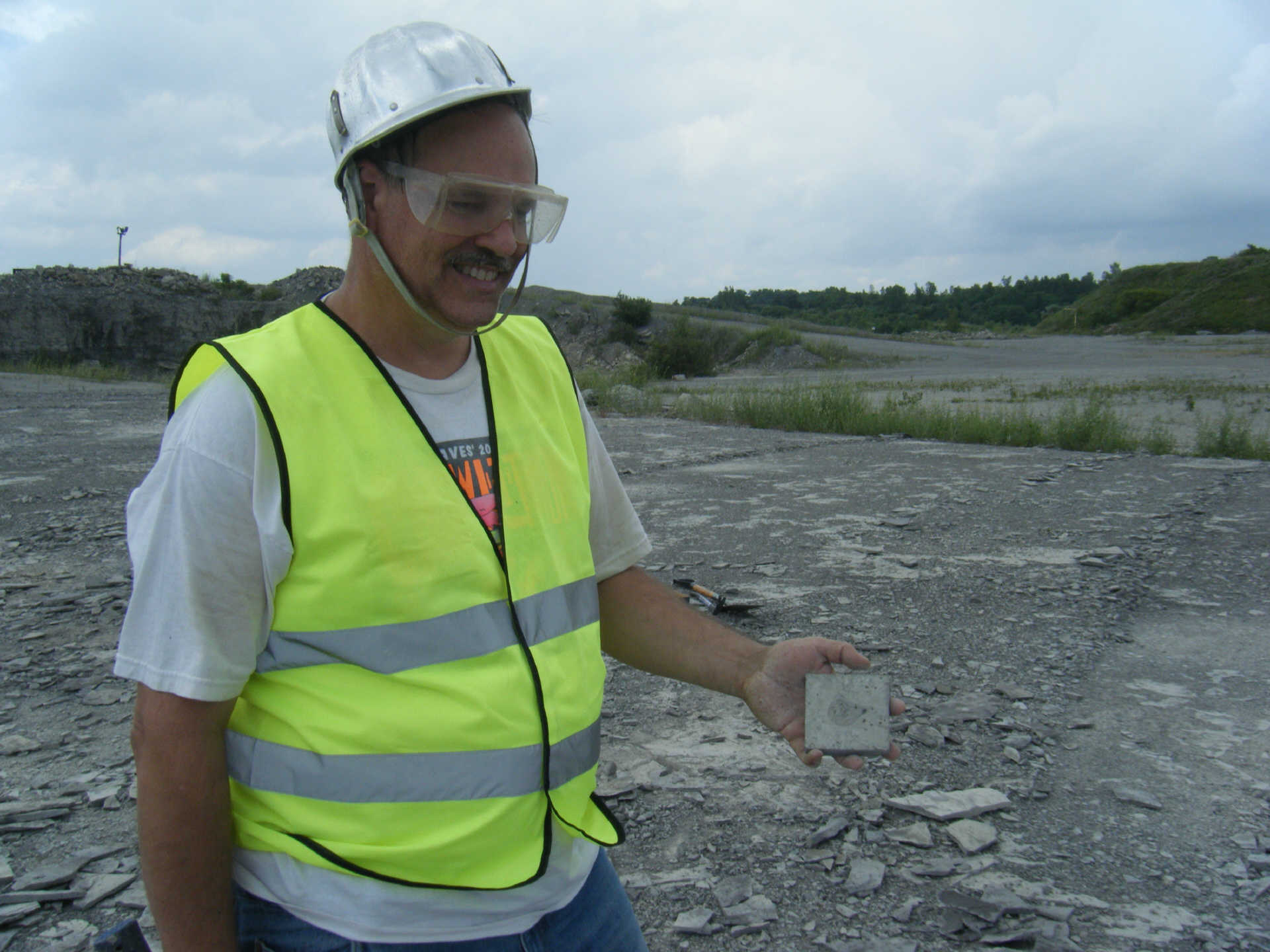 Approximately 20 of us went to the Ridgemount Quarry in Fort Erie, Ontario, Canada on Friday. There was a light drizzle when we met for breakfast, but skies mostly cleared by the time we crossed the border. Other than a few momentary “mists” (which actually felt good) conditions remained dry at the site. With the assistance of two Canadian amateur paleontologists on site, we were soon digging for Eurypterids. While none of the U.S. attendees found any whole ones, one of the Canadians did – proving they WERE there. This type of excavation was very different from what most of us were used to, so the learning experience was very beneficial. Everyone found something worth bringing home, so it was a good day overall.