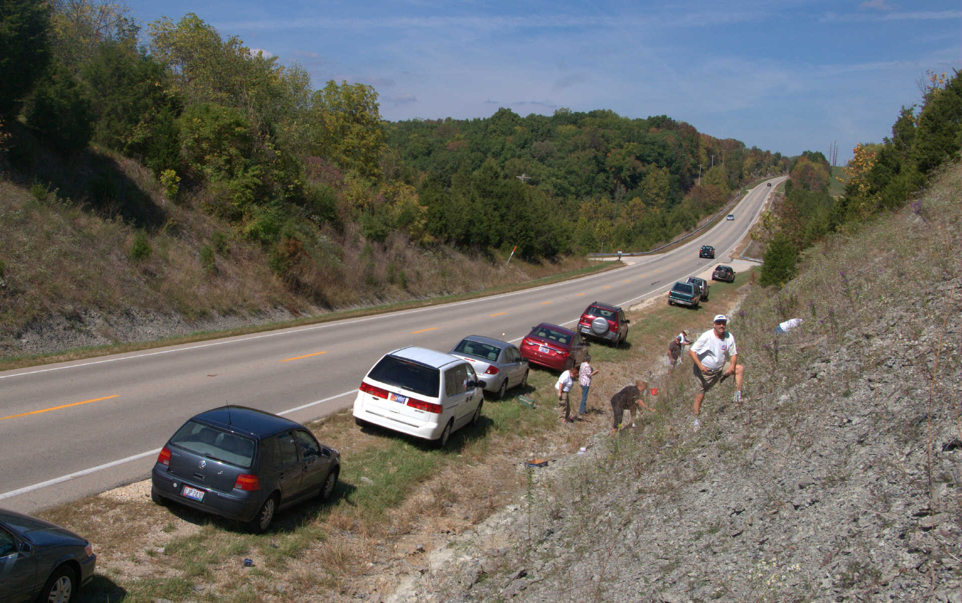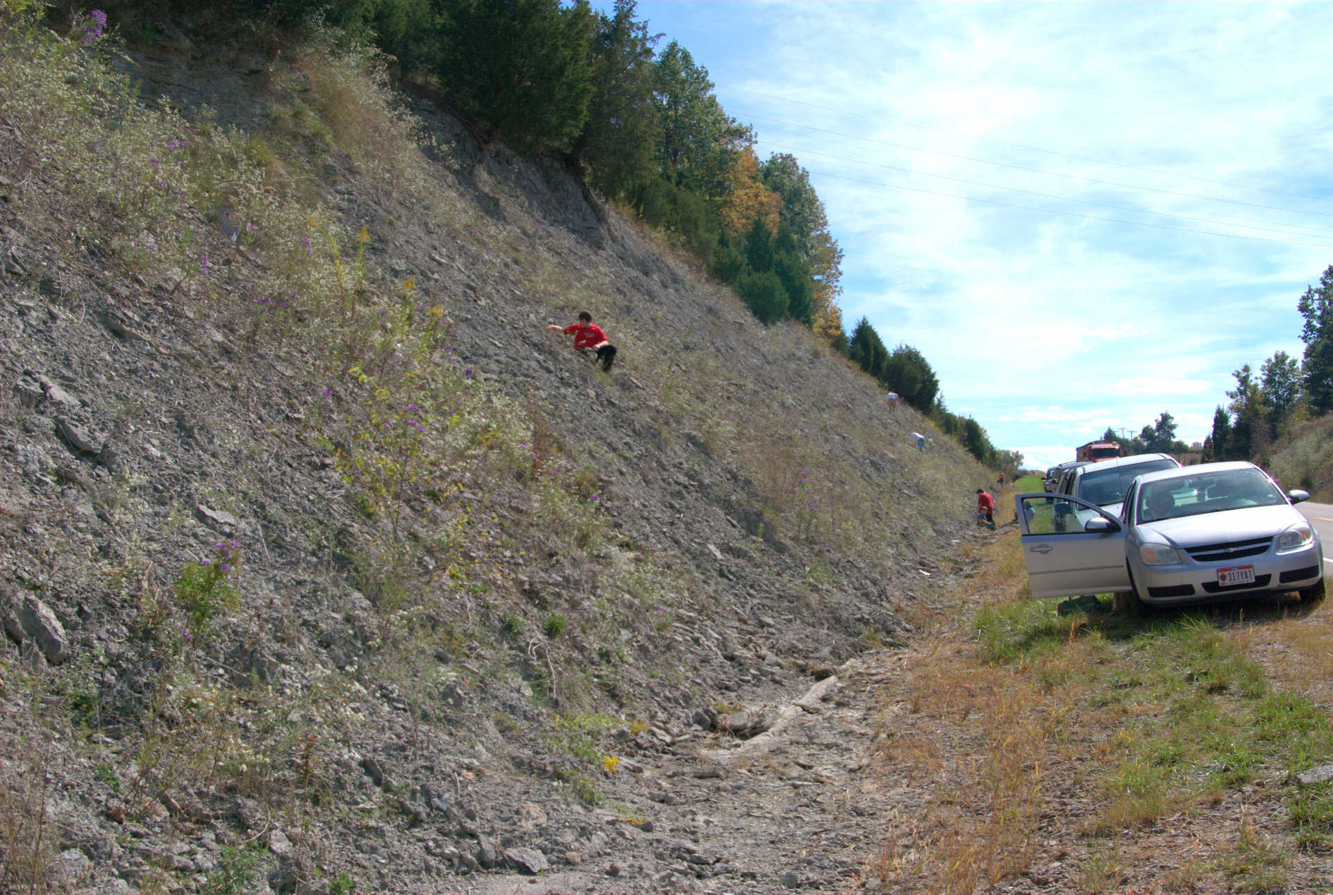 Our second stop was not as overgrown with vegetation as the first. The site in the old days had yeilded a number of Conularia. Now the site is "slumped" with material from the top layers sliding down and covering the lower layers. This site exposes most of the Liberty formation.