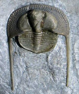 On this Cryptolithus glabella, you can see the occipital spine. This is a spine almost never preserved on specimens and is found protruding from the axial lobe of the glabella. (Click on the thumbnail image to see the occipital spine better.) |