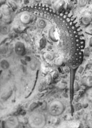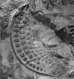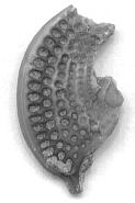 The "lace collar" of the Cryptolithus is it's most commonly found fragment. In fact, it is the only fragment you are likely to find from Cryptolithus. It is abundant in the Southgate member of the Latonia Formation. They can be found loose in the mud or encased in shale. The lace collar is identified by it's round indentations that are lined up in rows along the curve of the trilobite's genal area. The lace collar terminates with a genal spine. |