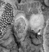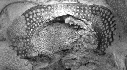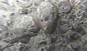 This is the inside of the "lace collar." Instead of indentations, you see raised dots lined up in rows along a curve. The raised dots have a hollow center, as shown at left. |