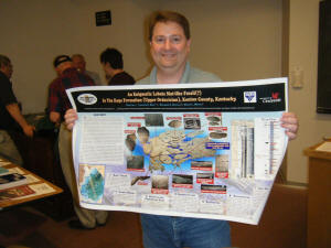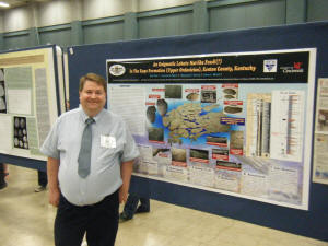 Professor Dave Meyer announced that Dry Dredger Ron Fine is the senior author for a poster session at the upcoming GSA North-Central Section meeting in Dayton, Ohio April 23 and 24. Entitled: An Enigmatic Lobate Mat-like Fossil(?) In the Kope Formation (Upper Ordovician), Kenton County, Kentucky, the poster is based upon Ron�s new mystery fossil from the Kope that was displayed at recent meetings. This find may represent a biological mat heretofore not known from the Cincinnatian.