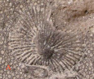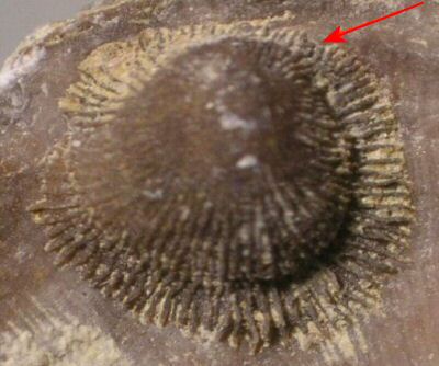 These two Philhedra (below) are pretty typical, a conical shell, tall relative to the width, with many fine ribs radiating from the apex and terminating as spines along the entire margin. In particular, note that the spines at the rear end (see arrows) are the same thickness and length as all the others. They can be found on almost any hard surface, regardless of roughness. I have found them in the Richmondian of Ohio and Indiana.