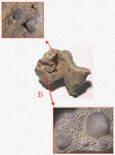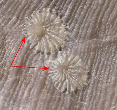This is what I believe may be a second species (pictured below and above). About twenty percent of my specimens have a low conical shell, relative to the height. The ribs are fewer in number and thicker than the common variety. Of special note (see arrows) are the spines at the rear end, which are shorter than the rest and thinner. These characteristics hold regardless of size. I have only found the mystery Philhedra on smooth surfaces, which I presume is because the internal tissue couldn�t function well on rough surfaces due to being flatter than the regular variety. I have only found them at sites in Indiana.