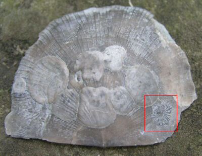 Mystery Philhedra with Petrocrania on brachial valve of Rafinesquina.