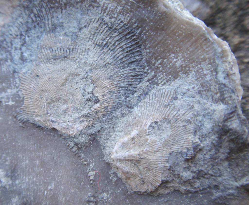 I came across a layer at the very bottom of the Corryville Formation of the Cincinnatian near Lawrenceburg, Indiana that has a large population of the somewhat uncommon inarticulate brachiopod, Schizocrania filosa. These Schizocrania were all attached to the tops and undersides of the articulate brachiopod, Rafinesquina.