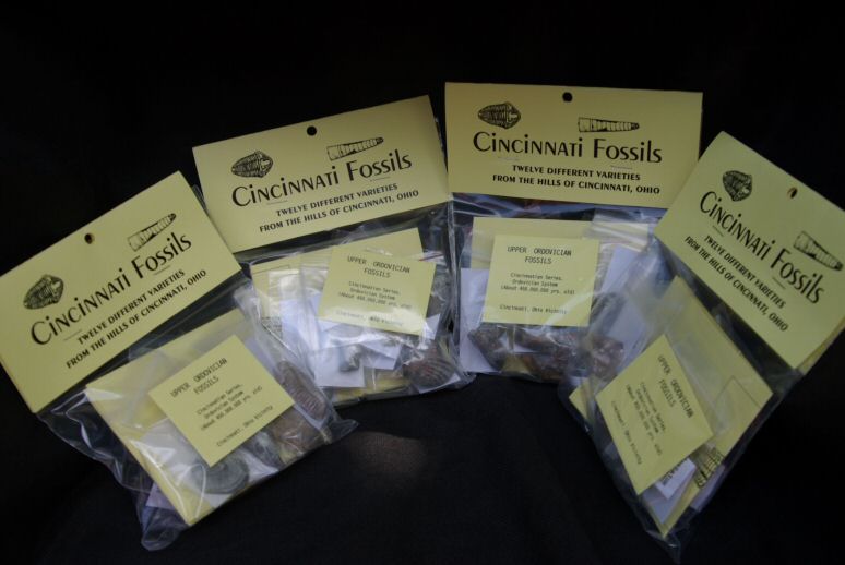 Manufactures and sells bags of fossils at local gift shops and other non-profit and not-for-profit venues in the area. For decades, this has been the primary source of funds for our contributions to the University of Cincinnati Department of Geology and to the Dry Dredgers Paleo Research Award. These fossil kits are named "Cincinnati Fossils." They showcase and illustrate Cincinnati's fossil heritage as part of our educational outreach.